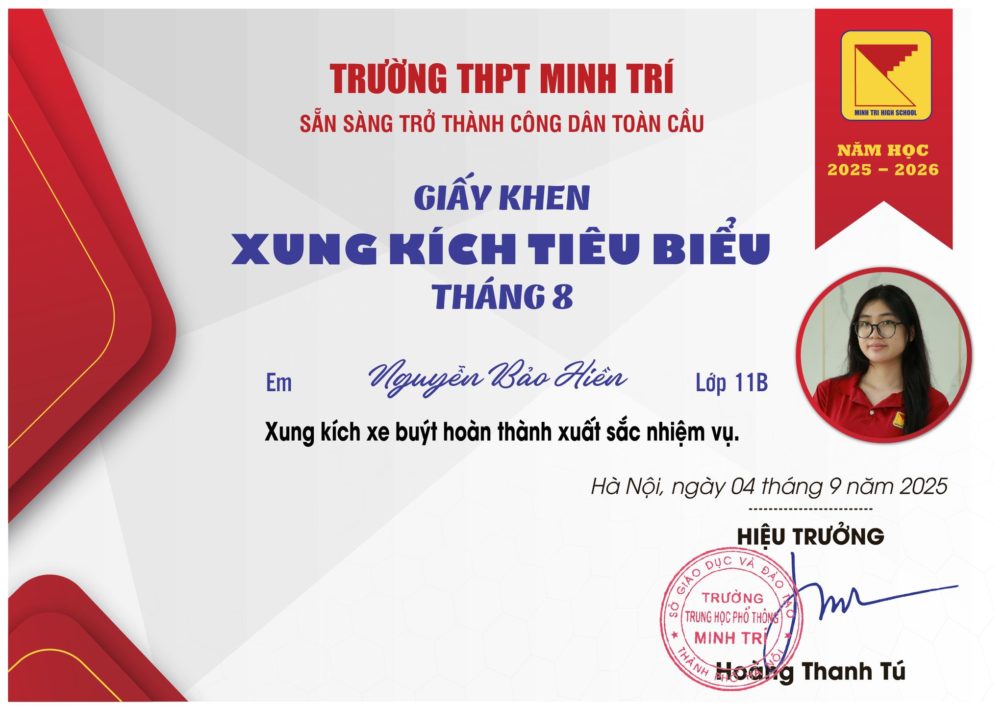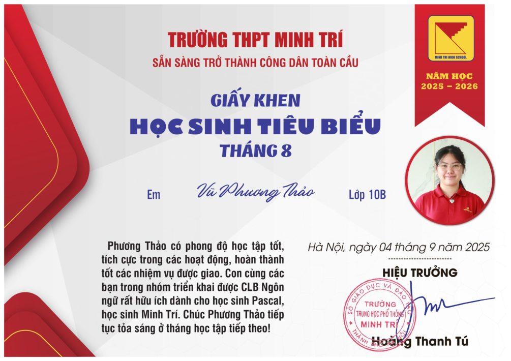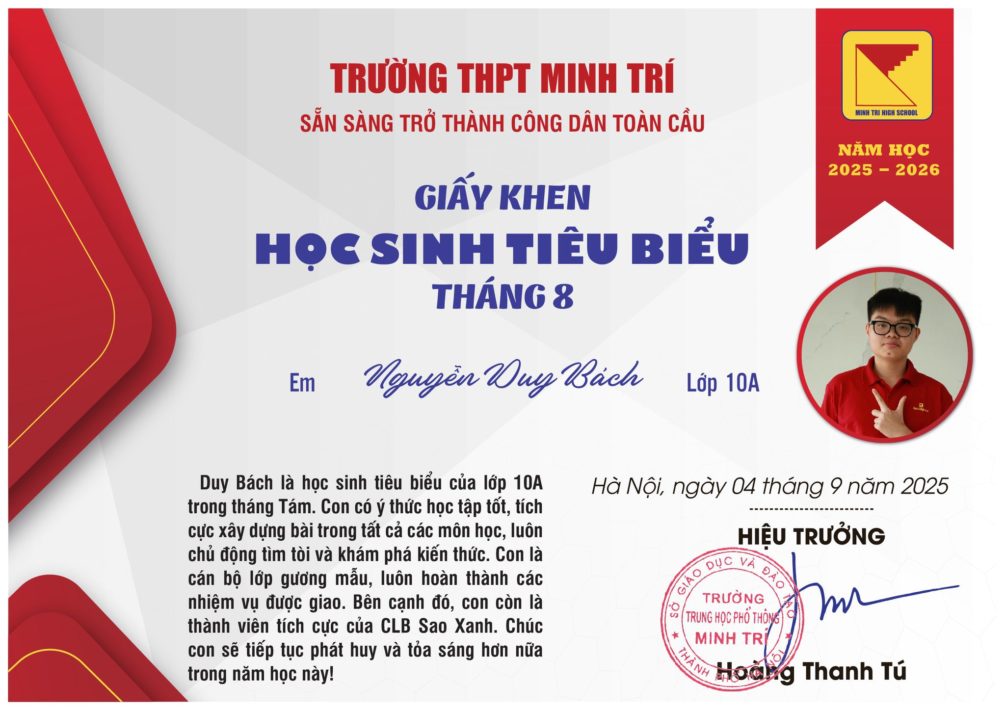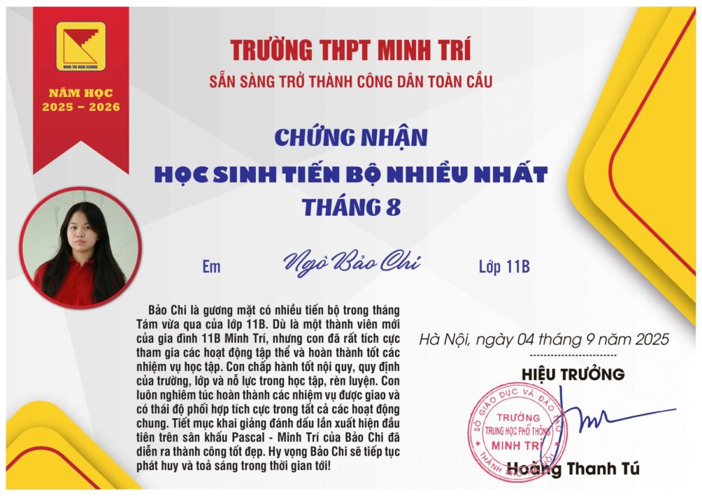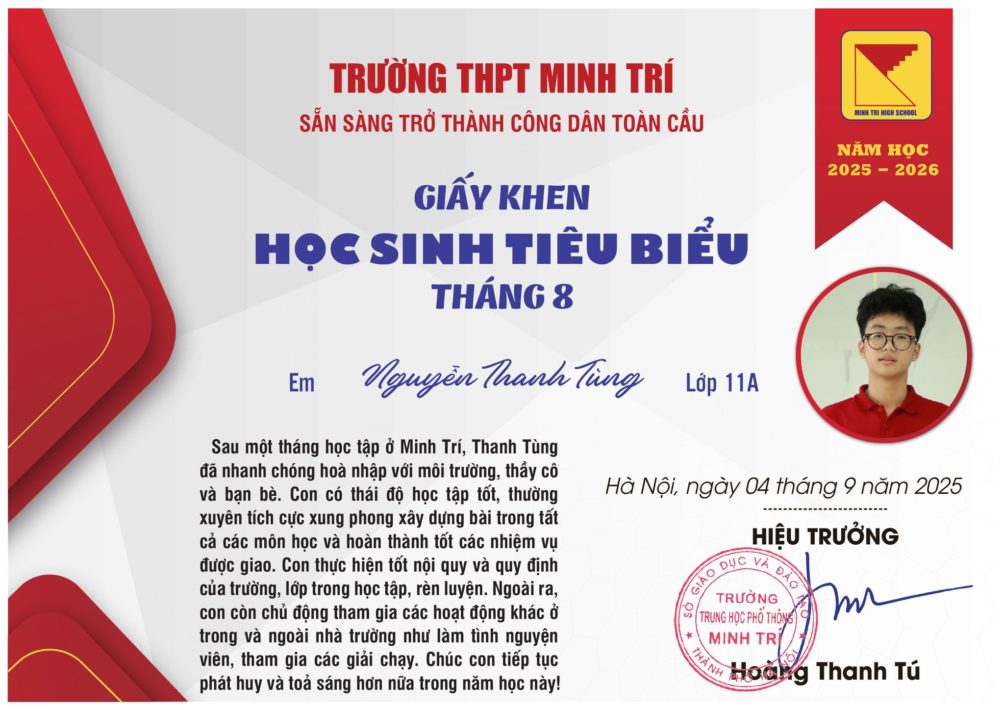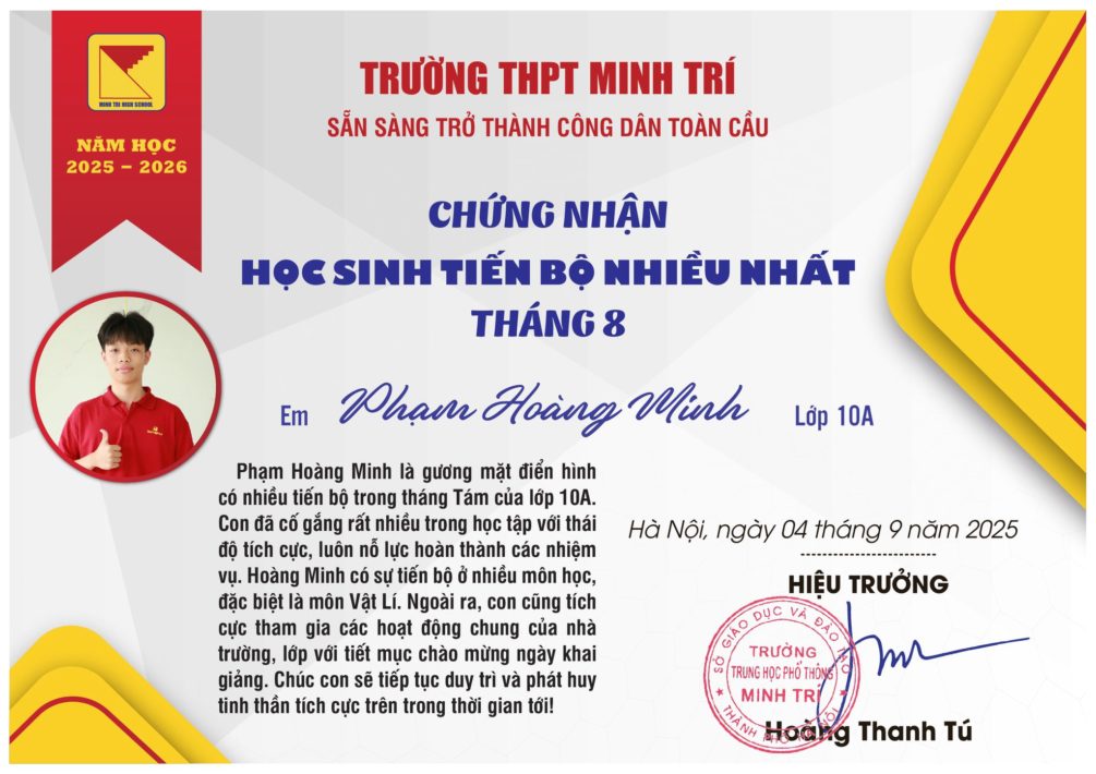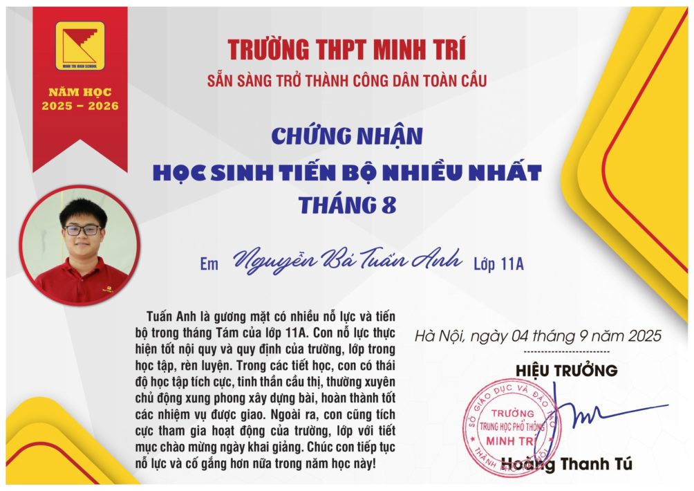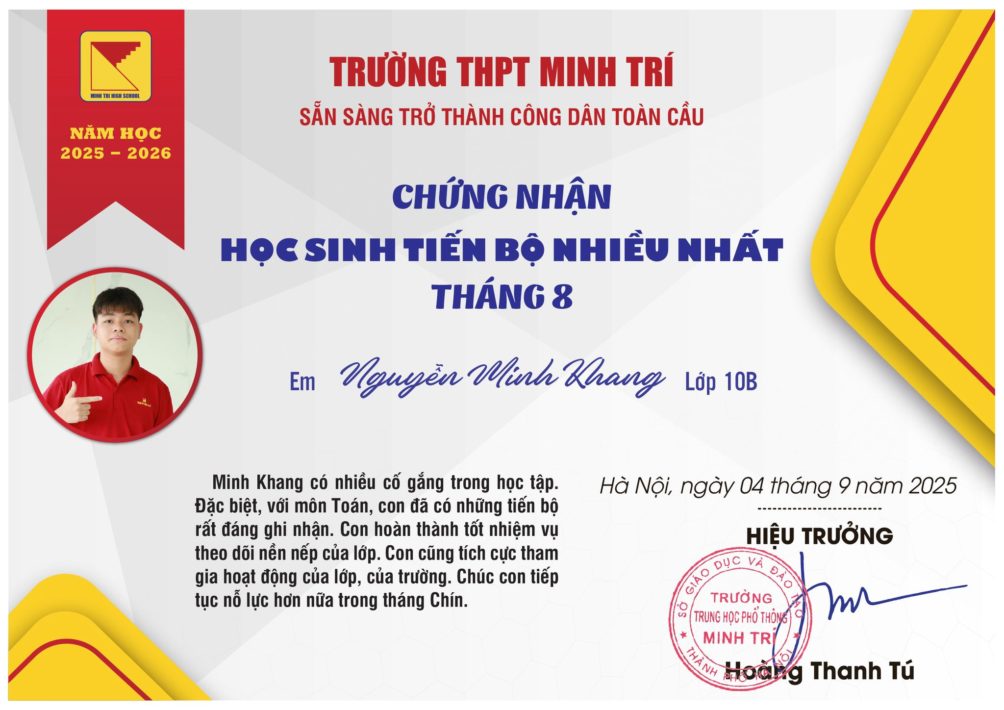 Trường THPT Minh Trí chúc mừng và biểu dương các gương mặt học sinh tiến bộ, nỗ lực, tiêu biểu trong học tập, hoạt động tháng Tám năm 2025.