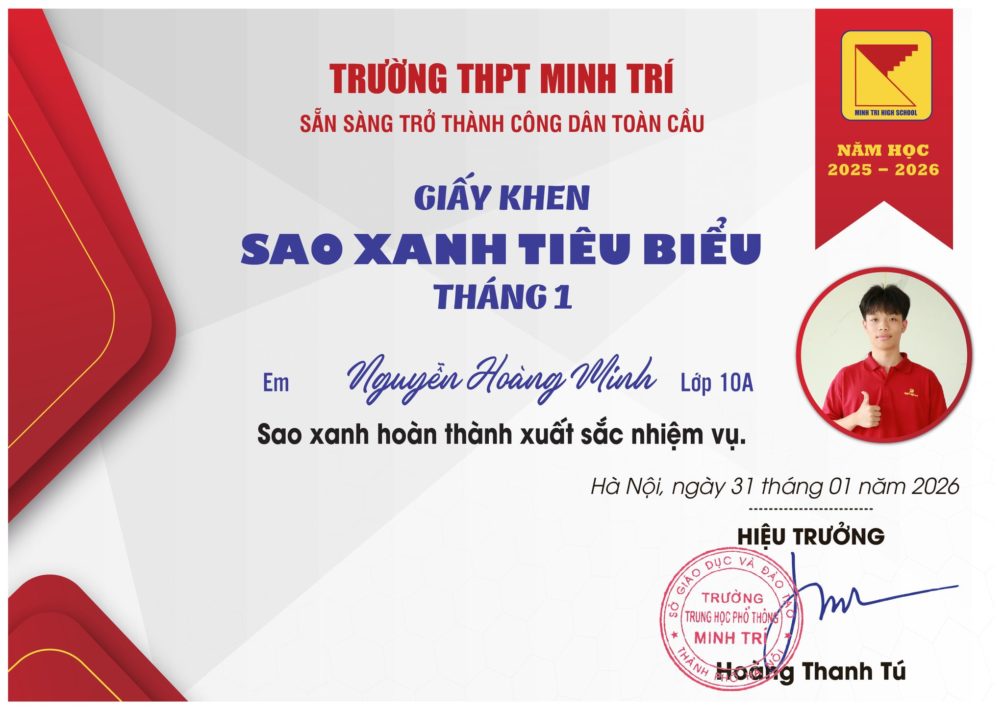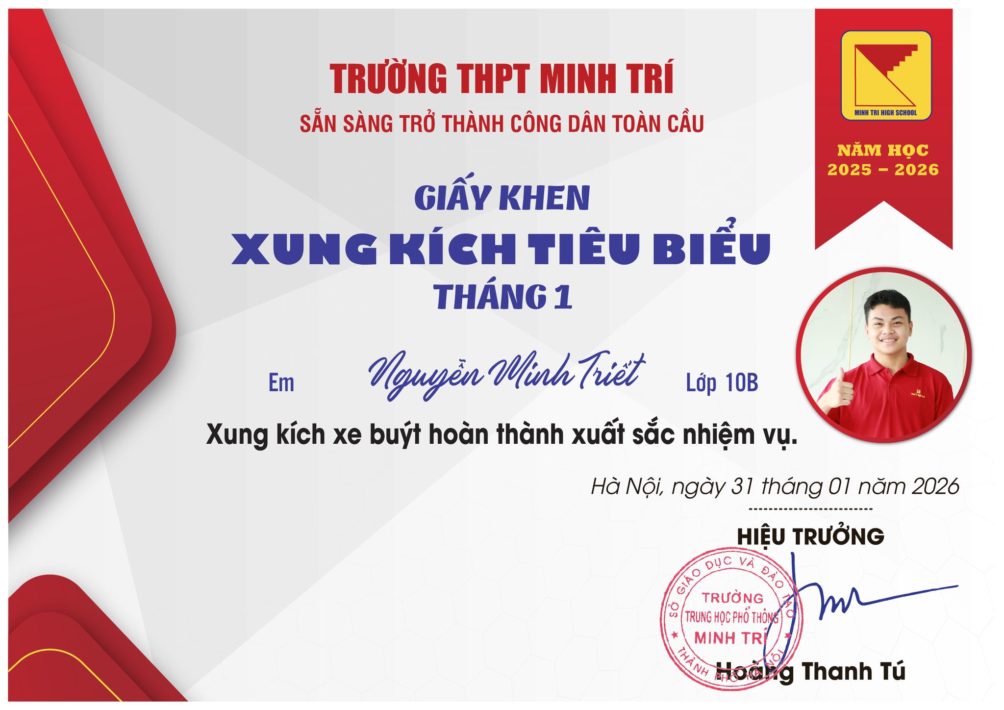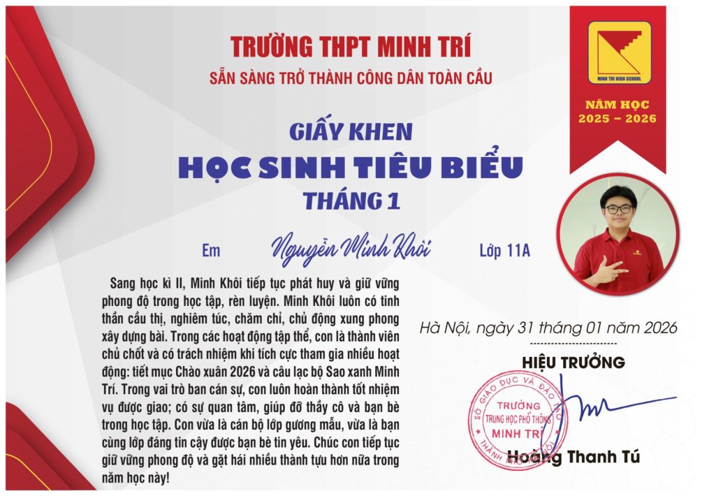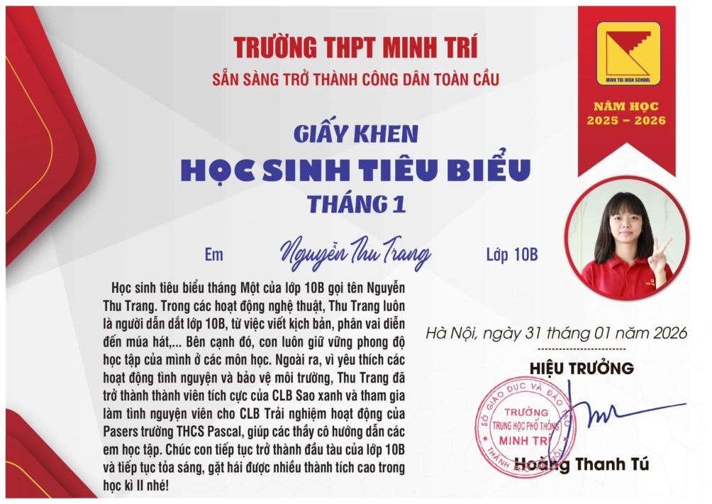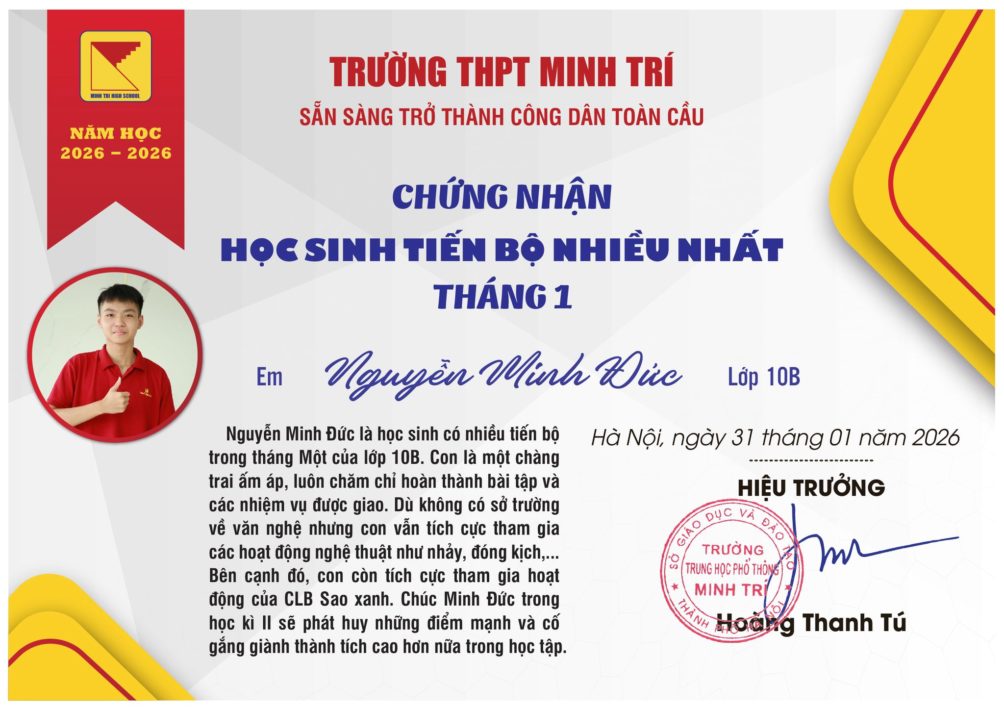 Trường THPT Minh Trí chúc mừng và biểu dương các gương mặt học sinh tiêu biểu, tiến bộ nhiều nhất tháng Một năm học 2025-2026. Chúc các bạn tiếp tục tỏa sáng ở các tháng học tập tiếp theo!