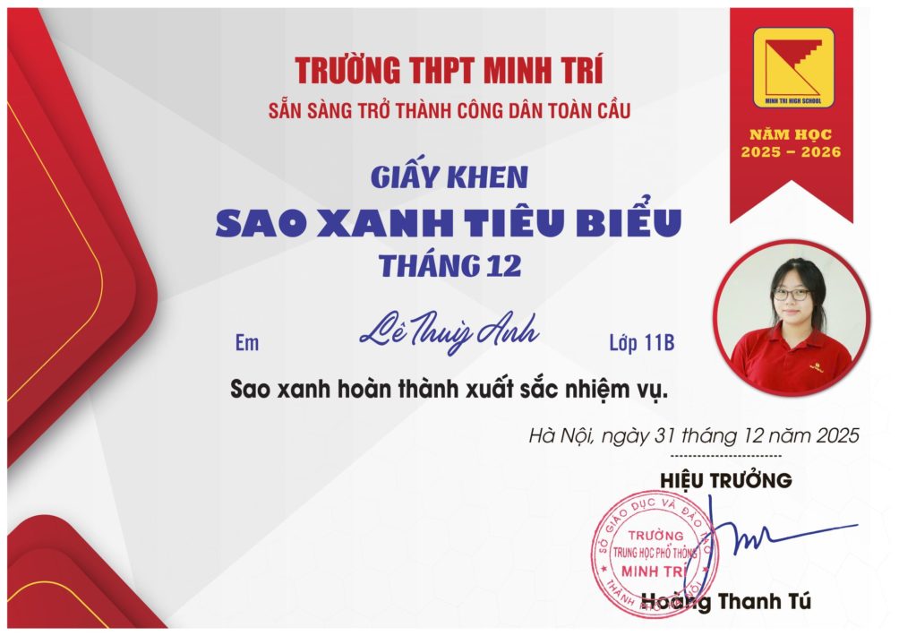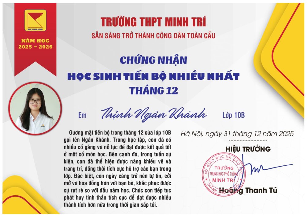 Trường THPT Minh Trí chúc mừng và biểu dương các gương mặt học sinh tiêu biểu, tiến bộ nhiều nhất tháng 12 năm học 2025-2026. Chúc các bạn tiếp tục tỏa sáng ở các tháng học tập tiếp theo!
