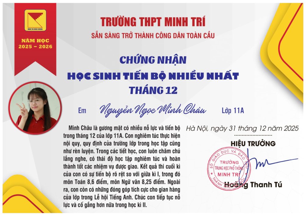 THPT MINH TRÍ – HỌC SINH TIÊU BIỂU VÀ TIẾN BỘ THÁNG 12. NĂM HỌC 2025 – 2026